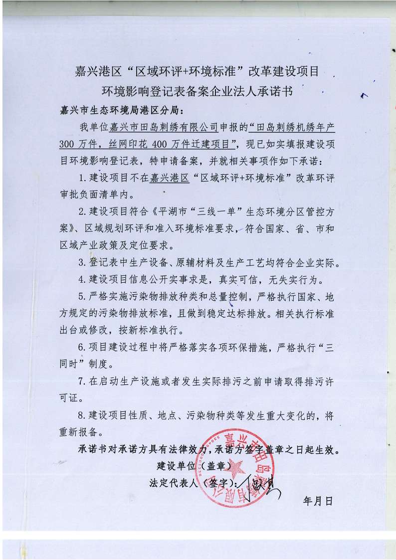 關(guān)于田島刺繡機(jī)繡年產(chǎn) 300 萬(wàn)件,絲網(wǎng)印花 400 萬(wàn)件遷建項(xiàng)目環(huán)境影響登記表備案法人承諾書(shū)公示